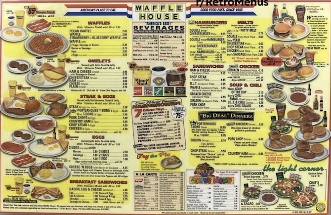 Now, the good thing about waiting that long was that we all had TONS OF TIME to look through the endless Waffle House menu. Each of us had carefully memorized our complex orders of eggs and biscuits and toast and burgers, all of which were smothered in various ingredients specific to the Waffle House universe. Dare I say waiting that long made the process of ordering almost euphoric, seeing as we were finally going to eat like kings.