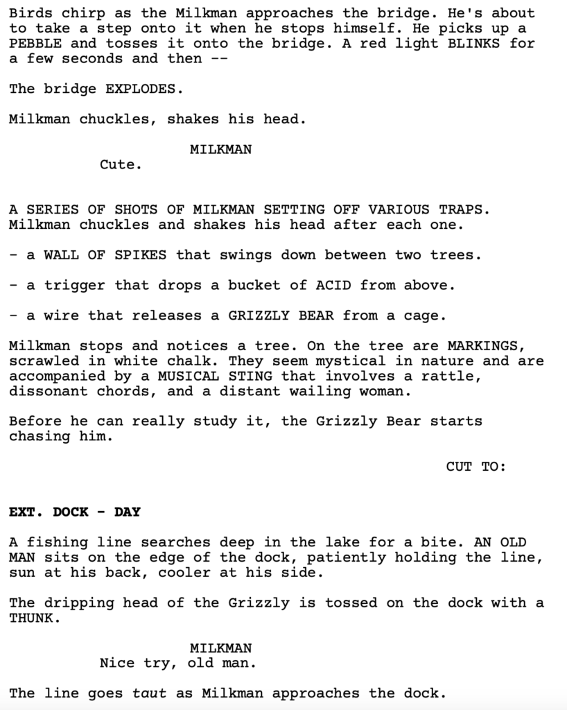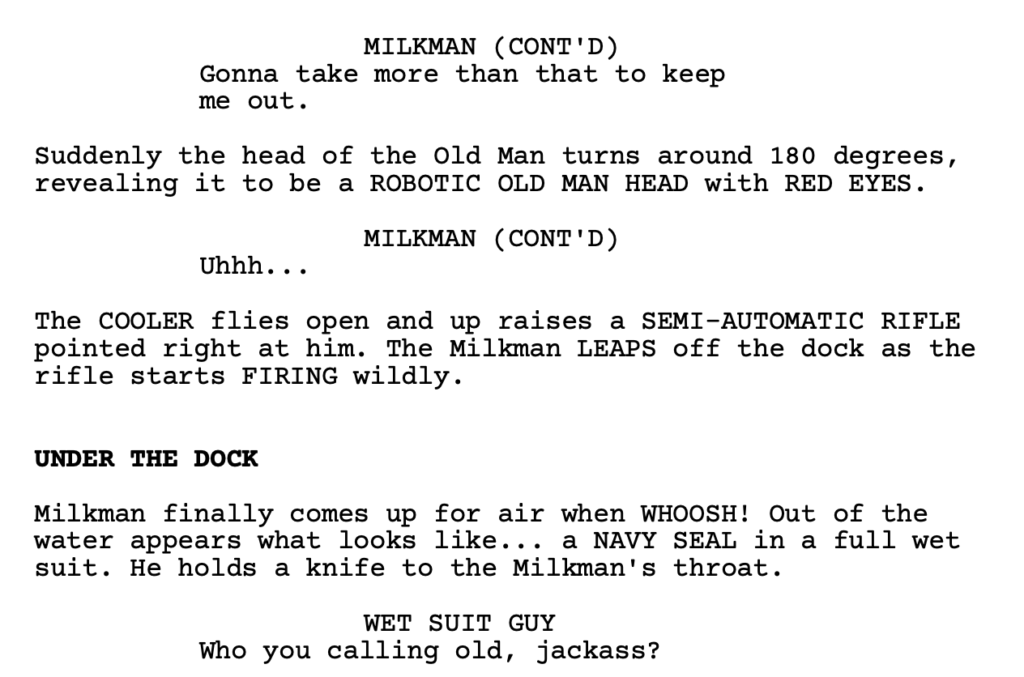 To be clear, that scene is not in the script. But there are similar scenes like that. That’s the mindset this writer has. Each scene needs to entertain all on its own. Each scene is driven by a situation occurring rather than people talking in random locations. That mindset ensures that the reader is always going to want to keep reading. Cause they know that each scene is being maximized for entertainment value.