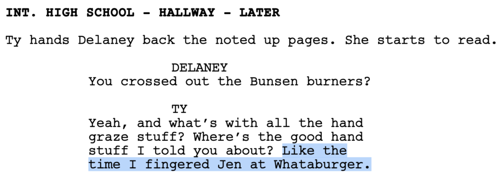 What I learned: A good joke option is to connect two things that don’t go together at all. The juxtaposition of those things is what makes the joke funny. Of course, there’s an art to this. You can’t just say “bears and popsicles” and expect people to laugh cause the two things are different. You have to play with some combinations to find out which ones sound the funniest against each other. But when you land on a good one, it’s gold. In this scene, Ty has read Delaney’s most recent pages and has feedback.
