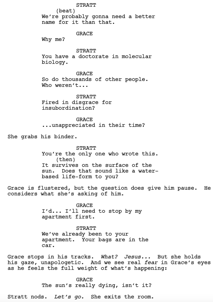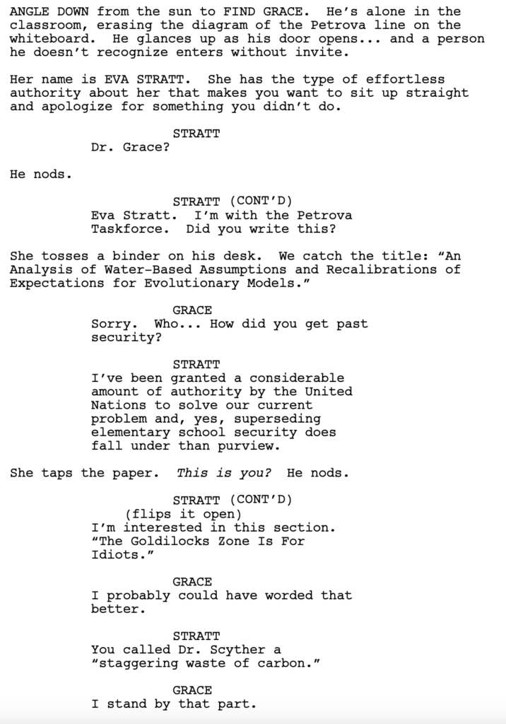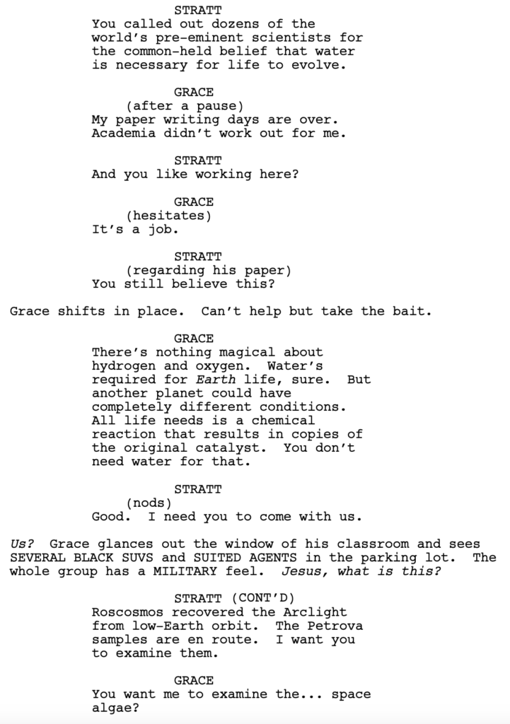 Again, this all goes back to the outline. Make sure that every section in that outline, that takes you from page 1 to page 100, from Act 1 to Act 3, from Sequence 1 to Sequence 8, all of it needs at least one primary character with a strong goal. That will ensure that each section has a powerful engine running beneath it. And every scene you write within that section will have a character with a goal in it, which’ll make your dialogue write itself. I’ll leave you with a very simple example of this from Project Hail Mary. This is where government worker Eva first shows up to Grace’s work to recruit him. She has the goal. The goal drives the dialogue. Happy weekend!