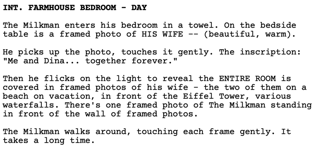 In this 180 page script, 9 out of every 10 scenes are strong. Which is an insane ratio. It’s very rare that I see that kind of ratio. And it’s because the writer understands that each scene is its own little movie that needs to entertain. And therefore, he builds scenes around that mindset.