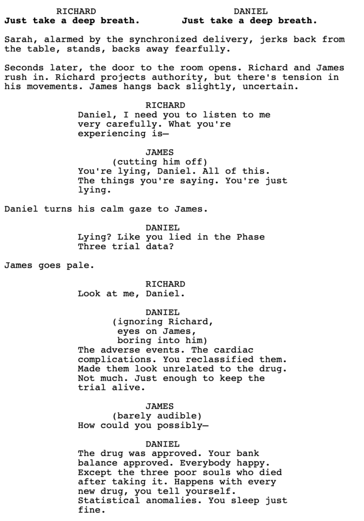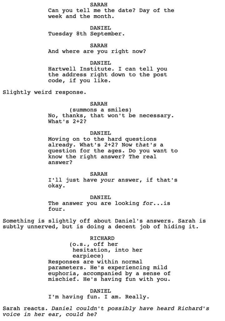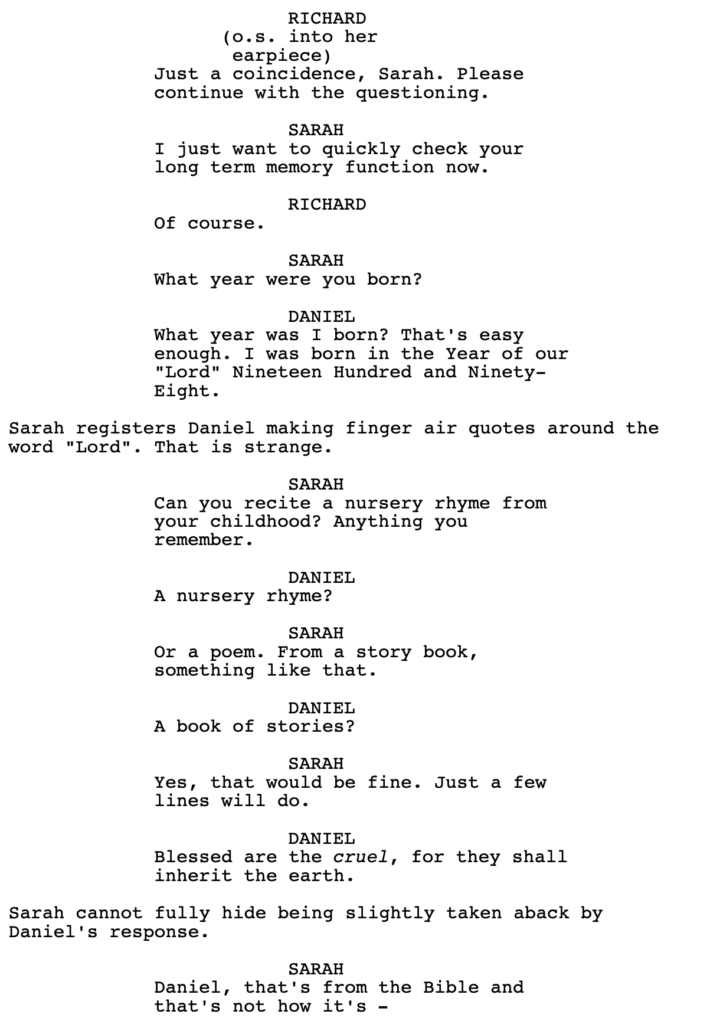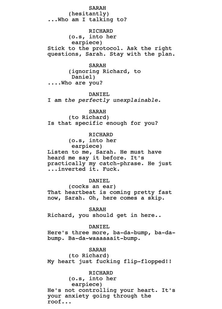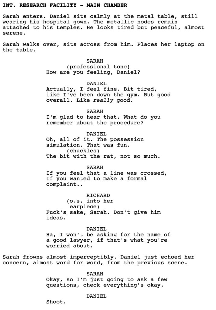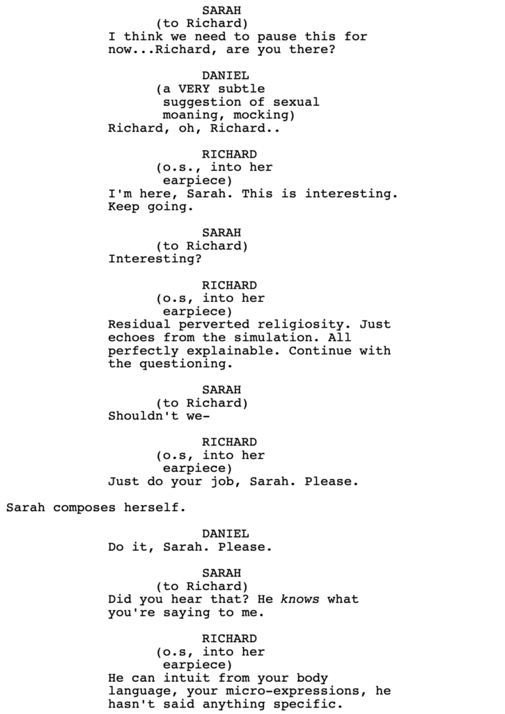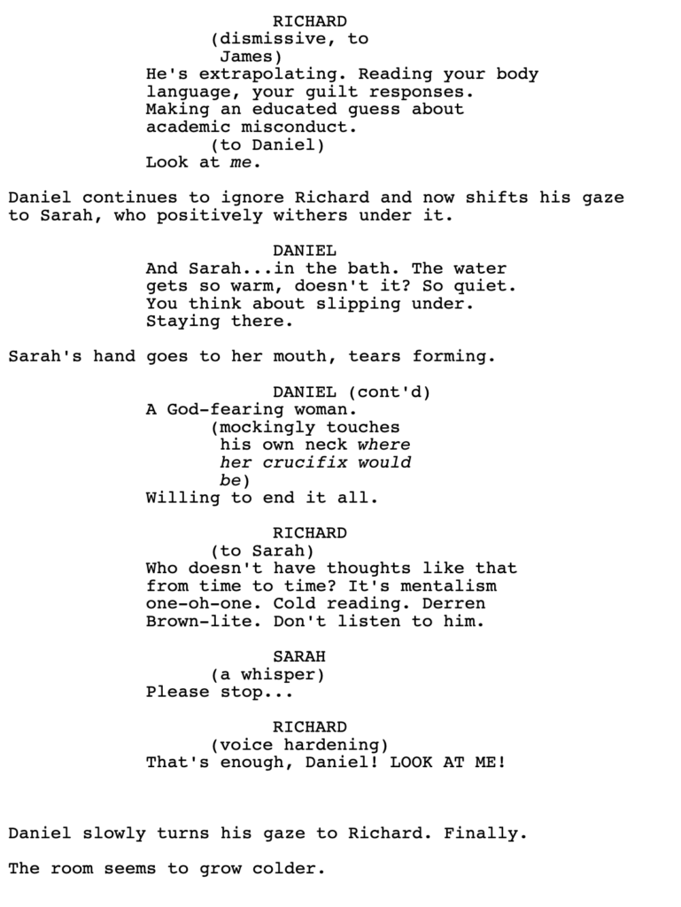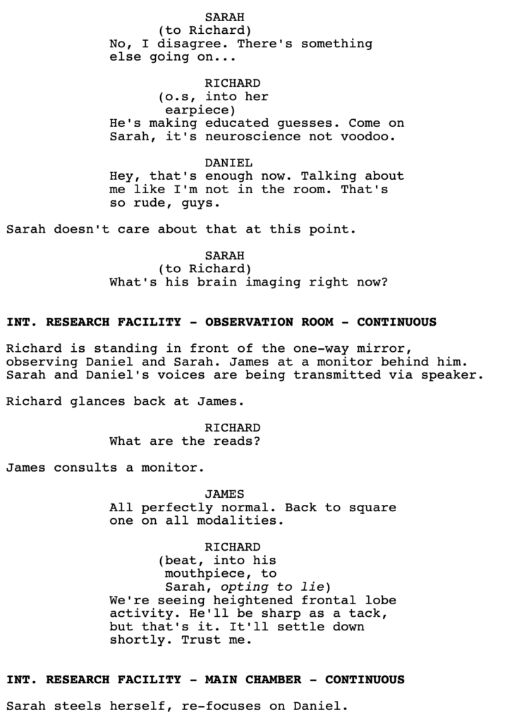 With that said, I haven’t read the whole script. We do get a line from Richard here, where he lies to Sarah, which implies that he’s snakey. If that’s set up appropriately before this scene – that he will sacrifice anything for this experiment – then I might change my tune. But it did feel false in the moment, as I was reading it.