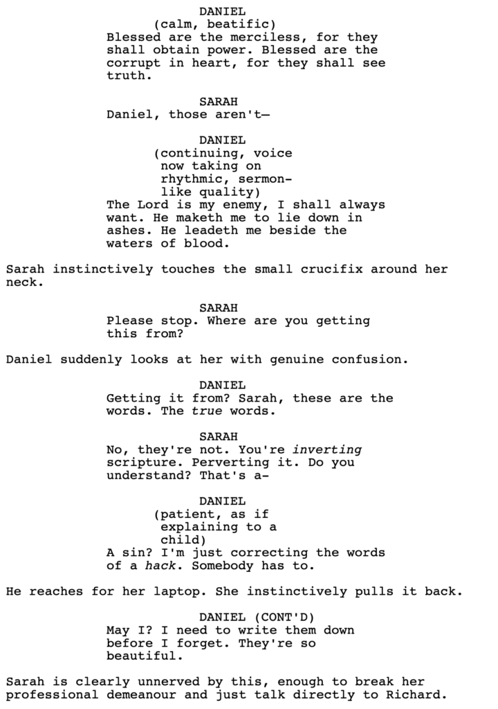 He chooses the latter. Daniel starts quoting lines from the Bible. There’s some fervor to the way he quotes the book, implying he’s passionate about the passage. There is no pretense anymore. At this point, we know he’s possessed. But Sarah doesn’t know that yet.