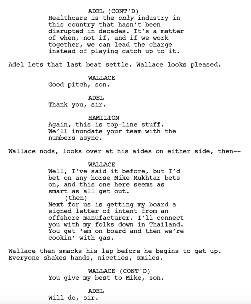 Beyond the unimaginative take on the idea, the script has zero GSU (goal, stakes, urgency). I suppose the goal is for Adel to succeed with his company, Yuca. But the goal-post for “succeeding” keeps moving throughout the script. And, as anyone who’s read this site for a long time knows, it’s nearly impossible to create stakes and urgency when you don’t have a clear goal. Because the goal is what creates the importance of meeting it (the stakes) and the timeline that must be met (the urgency).
